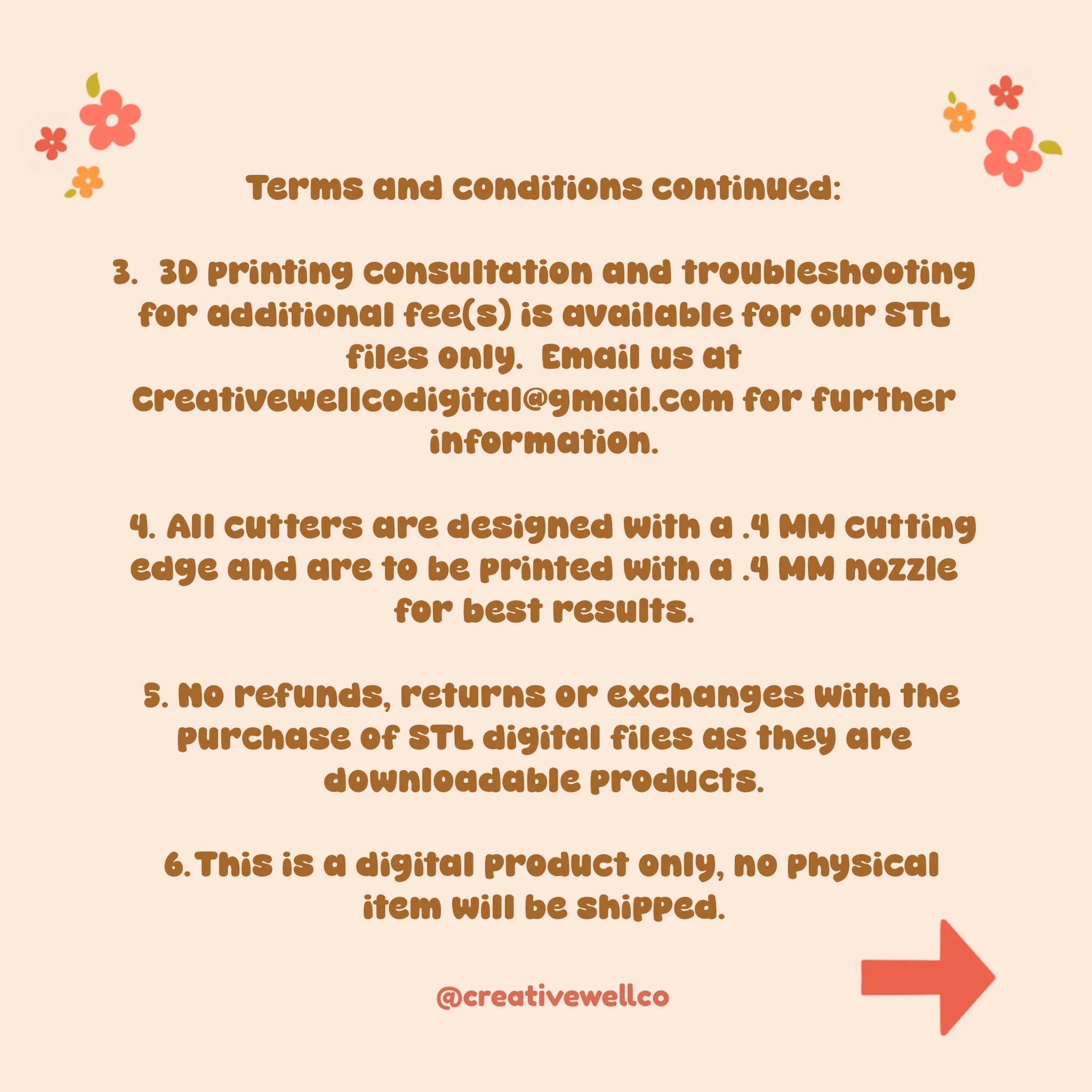 3D printing consultation and troubleshooting for additional fee(s) is available for our STL files only. Email us at Creativewellcodigital@gmail.com for further information.